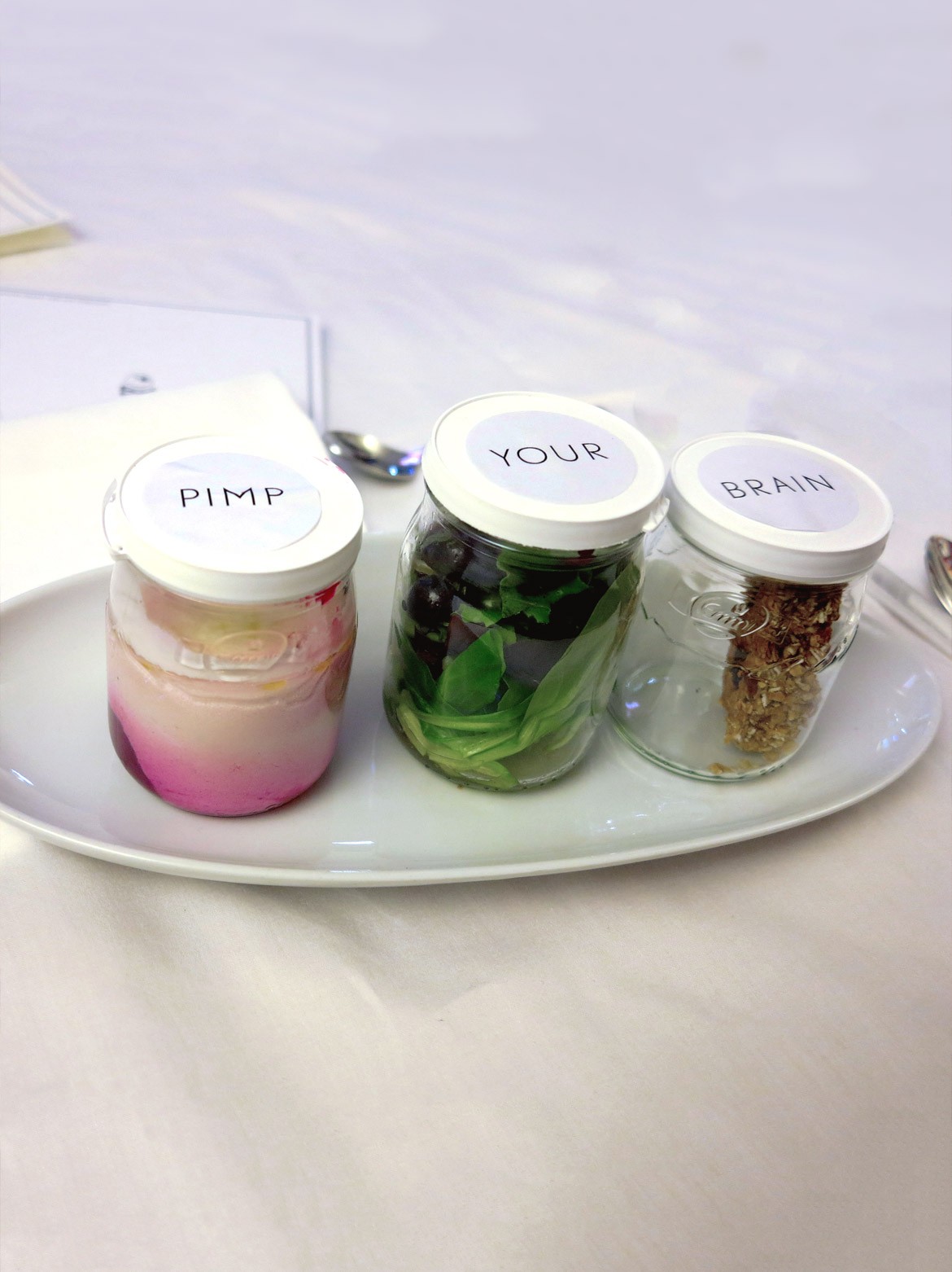 Die Gäste im «Gasthaus zum Übermorgen» bekamen Gerichte aufgetischt, welche an einen thematischen Hintergrund gekoppelt waren: Speisen aus dem 3D-Drucker oder Cremes, die von multifunktionalen Küchengeräten zubereitet wurden, foodporntaugliche Gerichte, aber auch alternative Proteinquellen oder Space Food für das Zeitalter der Besiedlung des Weltalls.